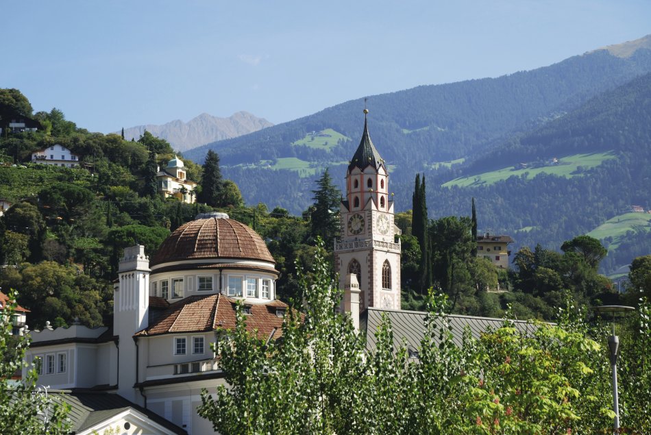 Im Tal von Obstgärten und Weinhügeln umgeben und weit oben von den Gipfeln der Texelgruppe geschützt, ist Meran ein außergewöhnliches Beispiel für die Symbiose aus mediterranem Flair und alpiner Herzlichkeit. Meran ist auch ein Ort für Genießer. Und das nicht nur auf kulinarische Art und Weise. Denn genießen können Sie hier herrlich angelegte Promenaden, Wanderungen auf einem der Waalwege, Fahrradtouren, Sehenswürdigkeiten, abendliche Sommerkonzerte oder fröhliche Weinproben.