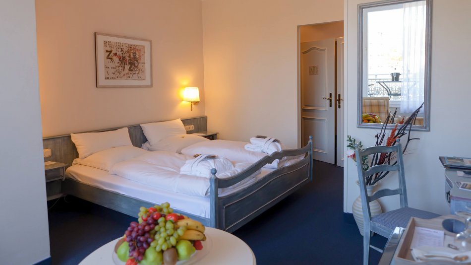 Standardzimmer: Badezimmer mit Dusche, WC,Föhn, Kosmetikspiegel; Sessel/Couch, Schreibtisch, Flachbildschirm, Safe, Telefon, WLAN. Die Zimmer befinden sich im Haupthaus und im Aparthotel nebenan.