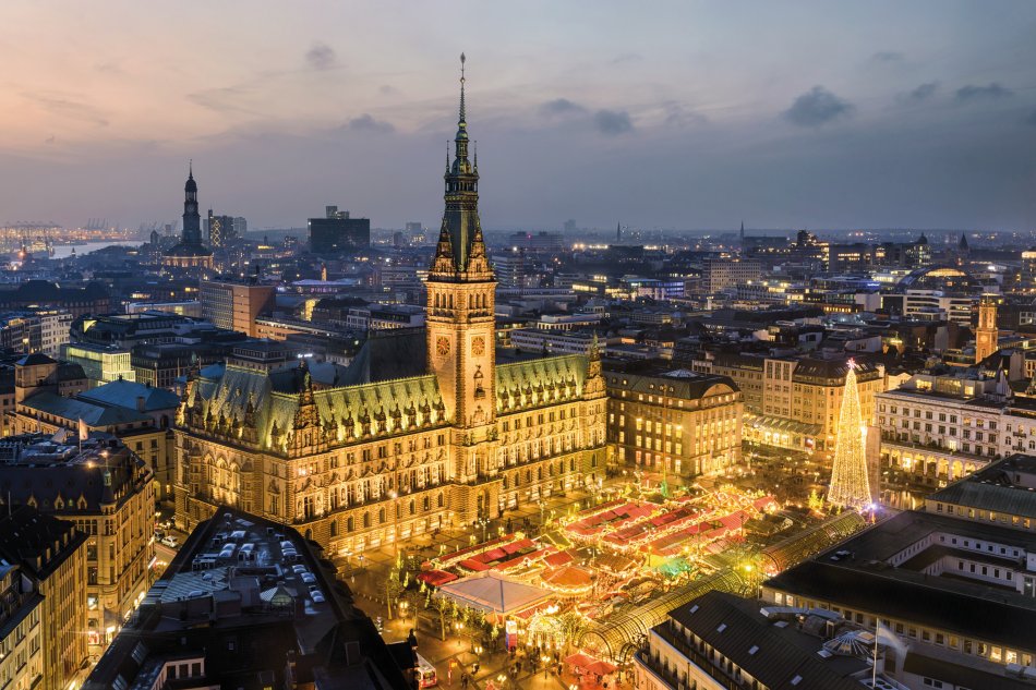 Vor dem beeindruckenden Hamburger Rathaus verzaubert Sie der historische Weihnachtsmarkt. Hier zeigen Kunsthandwerkerinnen & Kunsthandwerker ihr Handwerk vor dem leuchtenden Hüttenwerk.