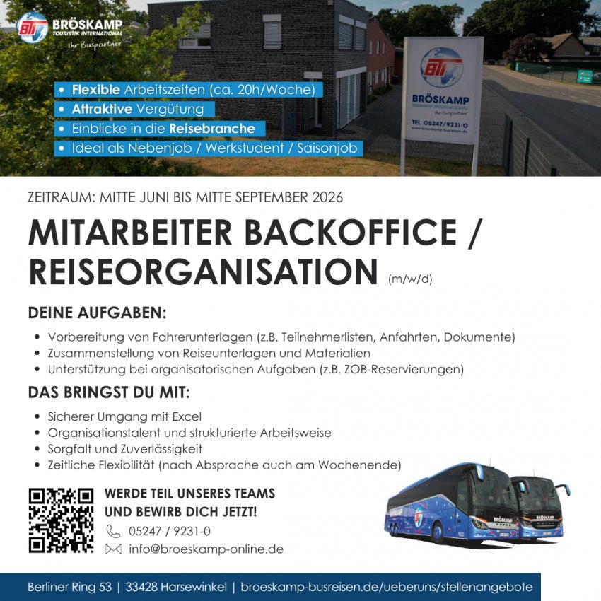 Dann werde Teil unseres Teams bei Bröskamp Busreisen in Harsewinkel und unterstütze uns in der Organisation unserer Reisen.